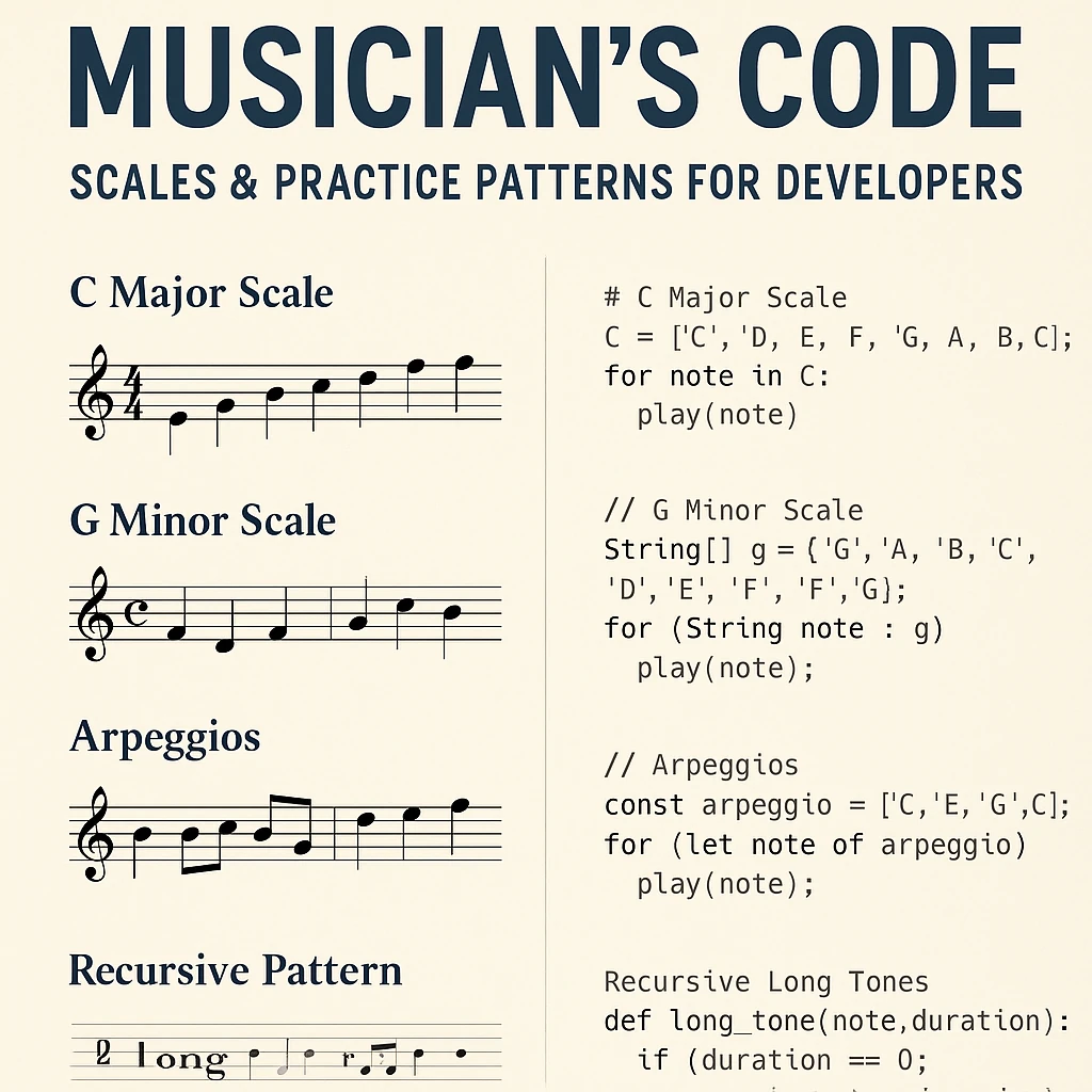 This resource is designed for musicians who want to hone their craft. Here, you find all the musical scales and chords to practice with trumpets, saxophones, pianos or guitars. It has an unusual twist by writing out scales as code in different languages.